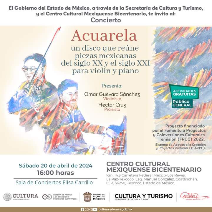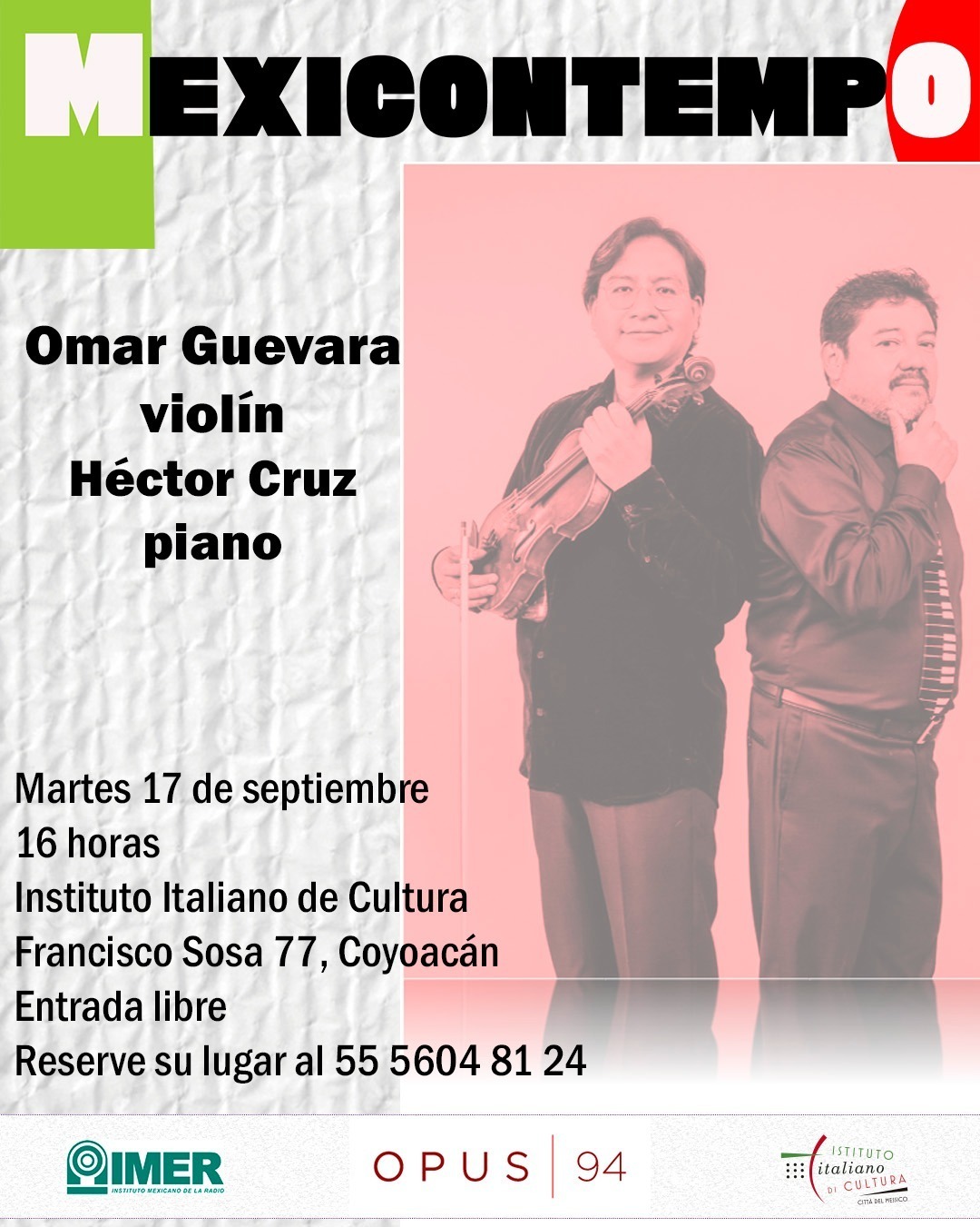 Estudio “A” Vicente Morales Ángel Urraza #622, Colonia del Valle,16 hrs Evento hibrido presencial y en vivo por transmisión radial. Martes 23 de julio de 2024 Mexicontempo Concierto: Acuarela, un disco que reúne piezas mexicanas del siglo XX y del siglo XXI para violín y piano. Instituto Italiano de Cultura Av. Francisco Sosa 77, Del … Leer más